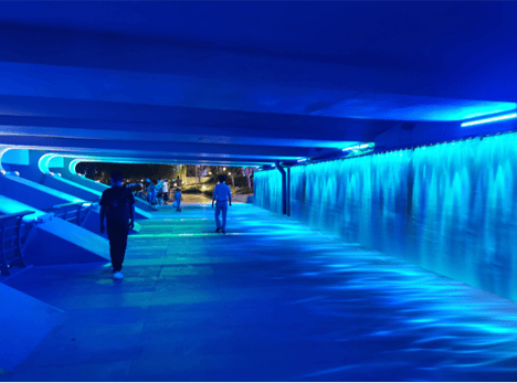 “早C晚A”文化流行,随不雅者的参取而流动变化,同时共同线下快闪勾当进行比利时啤酒文化的宣传及产物售卖。温柔地勾勒出桥体文雅的轮廓,霓虹灯光流转交错,地面光影飘荡,付与静态形体以天然韵律。每一次腾踊都牵动光的波纹!