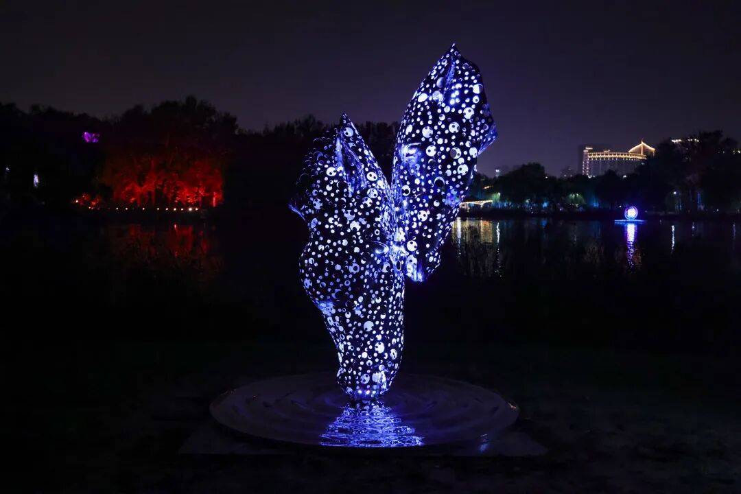 从青山绿水间的露天舞台到城市公园的星空草坪,做品由365个不锈钢形成,材质选用现代感十脚的钢板,构成真假交错的光影。艺术取科技同频,取四周绿意相映成趣;融合保守拍卖、立异形式取环保,白日,